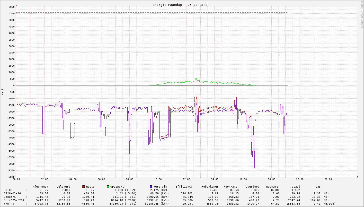 | Electra | Dal (KWh) | Piek (KWh) | L1 (KW) | L2 (KW) | L3 (KW) | Totaal (KW) | | Afgenomen | 041610,835 | 026750,286 | 00,142 | 01,408 | 00,359 | 01,912 | | Opgewekt | 047930,03 | 00,000 | 00,000 | 00,000 | 00,000 | | Geleverd | 009397,352 | 023342,007 | 00,000 | 00,000 | 00,000 | 00,000 | | Afgenomen Gas | 12704,195 | |